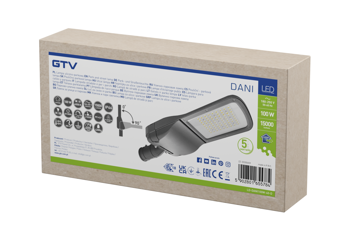 Pouliční a parková lampa DANI je moderní a efektivní řešení osvětlení, ideální pro aplikace v městských prostorách, jako jsou ulice, parky nebo sídliště. S vysokou světelnou účinností 150 lm/W poskytuje jasné a rovnoměrné osvětlení a neutrální barva světla 4000 K podporuje vizuální komfort a bezpečnost pro uživatele. Svítilna má nastavitelný úhel držáku ve dvou polohách (0° nebo 90°), což umožňuje její montáž přímo na sloup (držák svisle) nebo pomocí výložníku (držák vodorovně) s možností dodatečného nastavení sklonu. Vestavěná vodováha umožňuje přesně umístit lampu do správného úhlu.