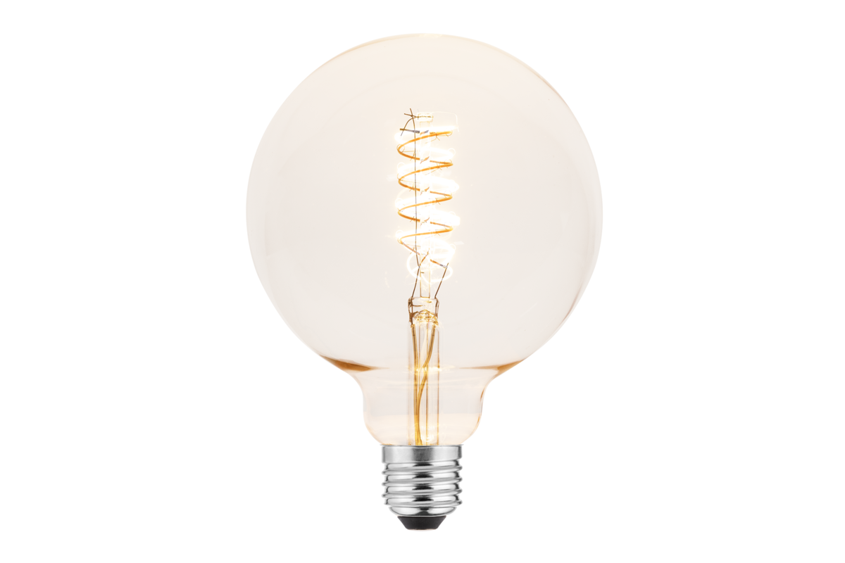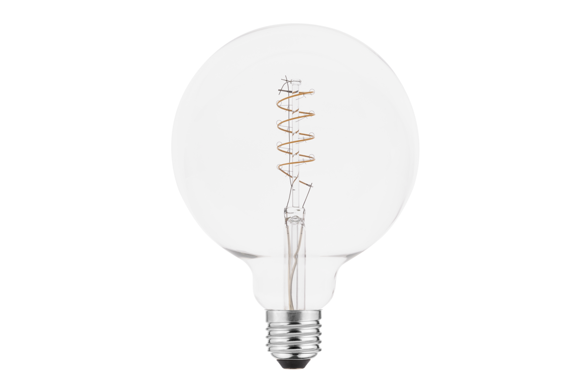 Vláknový LED světelný zdroj ve velké žárovce G125 se závitem E27 je moderní a stylové řešení osvětlení. Produkt se vyznačuje jedinečným filamentem stočeným do pružinové spirály, která mu dodává jedinečný vzhled. Má výkon 4 W, což se promítá do energetické účinnosti, a vyzařuje teplou barvu světla s teplotou 2200 K, čímž vytváří útulnou atmosféru. Světelný tok 265 lm poskytuje dostatečné osvětlení, ideální pro domácí interiéry.