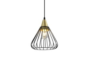 Černé kovové stínidlo ve tvaru zaobleného kužele dobře ladí se zlatou barvou úchytu. Spojení černé a zlaté činí lampu neobvyklou, poutavou a dodává interiéru jedinečný charakter. Bude proto skvělou dekorací do obývacího pokoje nebo do otevřené kuchyně, např. nad velký dřevěný stůl. Na cihlové zdi bude vypadat perfektně a stylově.