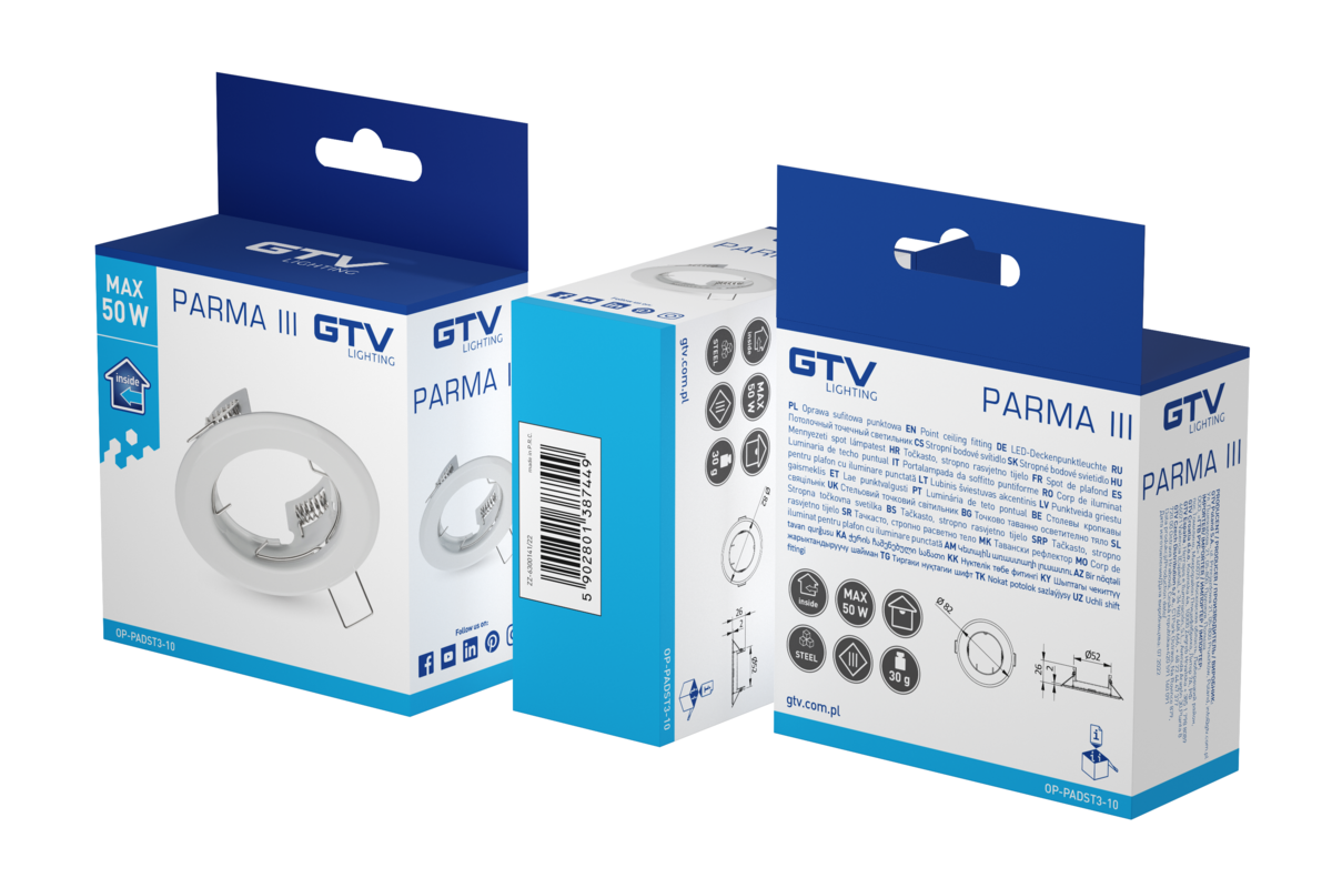 Der Deckenstrahler Parma II ist aus hochwertigem Stahl gefertigt. Raffinierte Details sorgen für Langlebigkeit und zuverlässige Qualität der Lichtpunkte. Dank ihres schlichten Designs fügt sich die Decken-Unterputzleuchte nahtlos in verschiedene Einrichtungsstile ein – von minimalistisch über modern, loftartig bis hin zu klassisch. Zur leichteren Anpassung an ästhetische Bedürfnisse ist die Punktleuchte in 5 Farbvarianten erhältlich: Chrom, Schwarzchrom, Weiß, Satin und Altgold. Durch die raffinierte Form mit einer „geschnittenen" Seite verbindet sich die Punktleuchte optisch mit der Oberfläche, an der sie montiert ist.