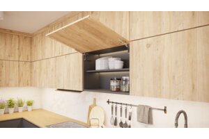 Ein mechanischer Aufzug, der es einfach macht, funktionale und moderne Hängeschränke zu entwerfen. Erhältlich in zwei Versionen, Soft-Close und Push-to-Open. Es sorgt für eine reibungslose Bewegung und Dämpfung beim Schließen von Schränken. Es ermöglicht das Anhalten der Klappe in jeder vom Benutzer eingestellten Position. Es gibt bis zu 3 Arten der Einstellung: Kraft, Schließzeit und Öffnungswinkel im Bereich von 90° bis 105°. Die Hebebühne wird in Klappen mit einer Höhe von 300 mm bis 650 mm eingesetzt. Die Auswahl aus bis zu vier Federstärkevarianten, die an die Höhe und das Gewicht der Front angepasst sind, ermöglicht ein breites Anwendungsspektrum. Es gibt 3 Farbvarianten der Endkappen: Weiß, Anthrazit und Schwarz. Einfache Installation ohne Verwendung zusätzlicher Schablonen oder Maße, bei der die Struktur des Aufzugs auch seine Montageschablone ist.