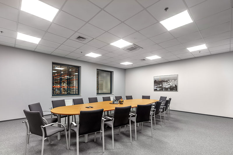 Wir haben das Büroteil des Gebäudes mit moderner Beleuchtung ausgestattet. In den Kabinetts und in den Konferenzräumen montierten wir die eingelassenen LED-Paneele PRINCE. Die Büros in dem Gebäude Delta Plus sind an einer Seite mit der Lagerhalle verbunden, deswegen gibt es dort keinen oder einen begrenzten Zugang zum Tageslicht. Daher war die Wahl der künstlichen Beleuchtung entscheidend – es war wichtig, dass die Lichtquelle mit dem Tageslicht zusammenwirkt und dass die Fläche gleichmäßig beleuchtet wird, wenn es kein Tageslicht gibt.