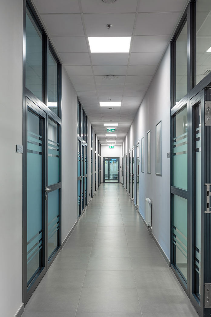 In den Fluren wurden neben den oben erwähnten Paneelen PRINCE auch die Paneelen MASTER montiert, die mit einem Notfallmodul versehen werden können. Die Anordnung der Fassungen an der Decke hing von der Höhe der Räume und Flure ab. Ihre Entsprechende Platzierung erlaubt die unkomfortable Blendung zu vermeiden. Zusätzlich wurden die Paneele MATIS verwendet, die sich in den Räumlichkeit ohne Tageslicht bewährt haben, z. B. in den Toiletten. In dem Gebäude Delta Plus entschied sich der Architekt für die in die Decke eingelassene Variante entschieden.