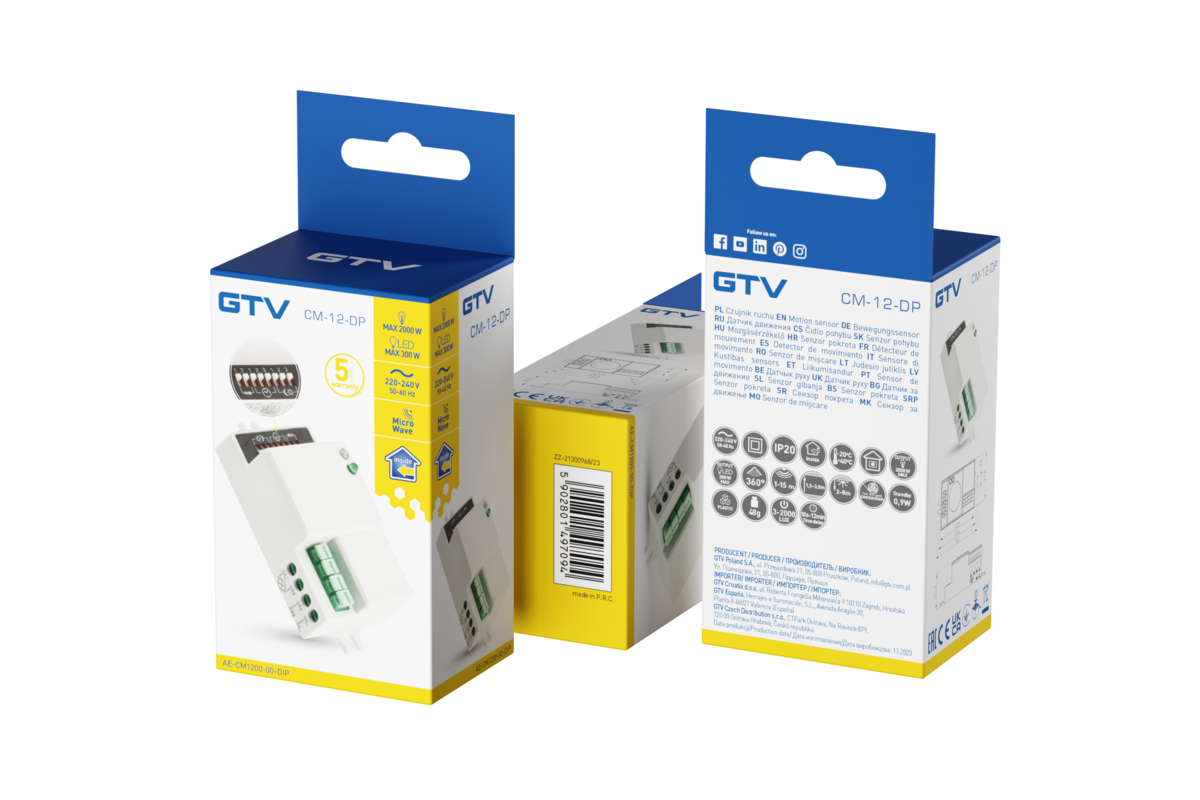 The GTV CM-12 DIP microwave motion sensor is an innovative solution that aims to increase the functionality and comfort of use of traditional ceiling luminaires. The sensor enables quick and easy transformation of a standard ceiling lamp into a modern ceiling lamp with motion detection, eliminating the need to replace the entire luminaire. It is an extremely convenient solution that allows you to effectively modernize your existing lighting system with minimal effort.