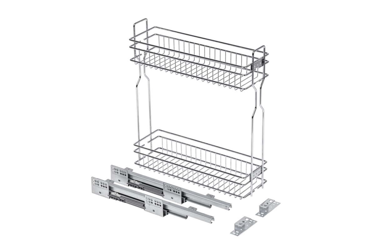 Kitchen furniture equipped with cargo, i.e. a retractable system with shelves, is excellent for storing more products and food supplies. They take up relatively little space, but are very roomy in themselves. The ability to slide the entire contents of the cabinet outside facilitates segregation and provides easy access to all products placed on the shelves. The undercounter system is available in chrome, withstands a load of up to 15 kg and is distinguished by an openwork bottom. Dedicated bottom mounting guides ensure full extension, silent closing function and high working culture. Fastening to the walls of the body and to the front of the cabinet ensures the stability of the structure, and adjustment in three planes facilitates the assembly process. One-sided installation depending on the selection of guides (the set does not include guides).