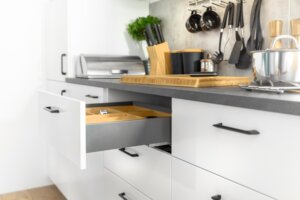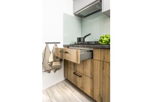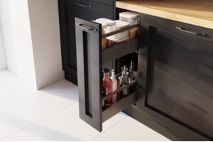Convenient and practical Axis Pro oven drawer for kitchen accessories. The drawer side panel, only 14 mm wide, gives the drawer a simple and modern look.