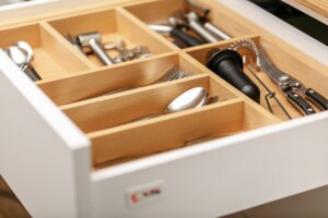 Organizers are an obligatory element of drawer equipment for modern furniture – thanks to them they are functionally developed, orderly and comfortable to use. The GTV SERIES of CUSTOMI cartridges is designed for the MODERN BOX and AXIS PRO drawer system – it is their functional complement and practical decoration. CUSTOMI inserts are made of high-quality beech wood, which affects the timeless style of this collection. Wood, due to its universal character, will blend beautifully with any kitchen building. What's more, the organizers are finished with a matte varnish, which provides additional protection against damage, as well as emphasizes and brings out the warm color of beech wood.