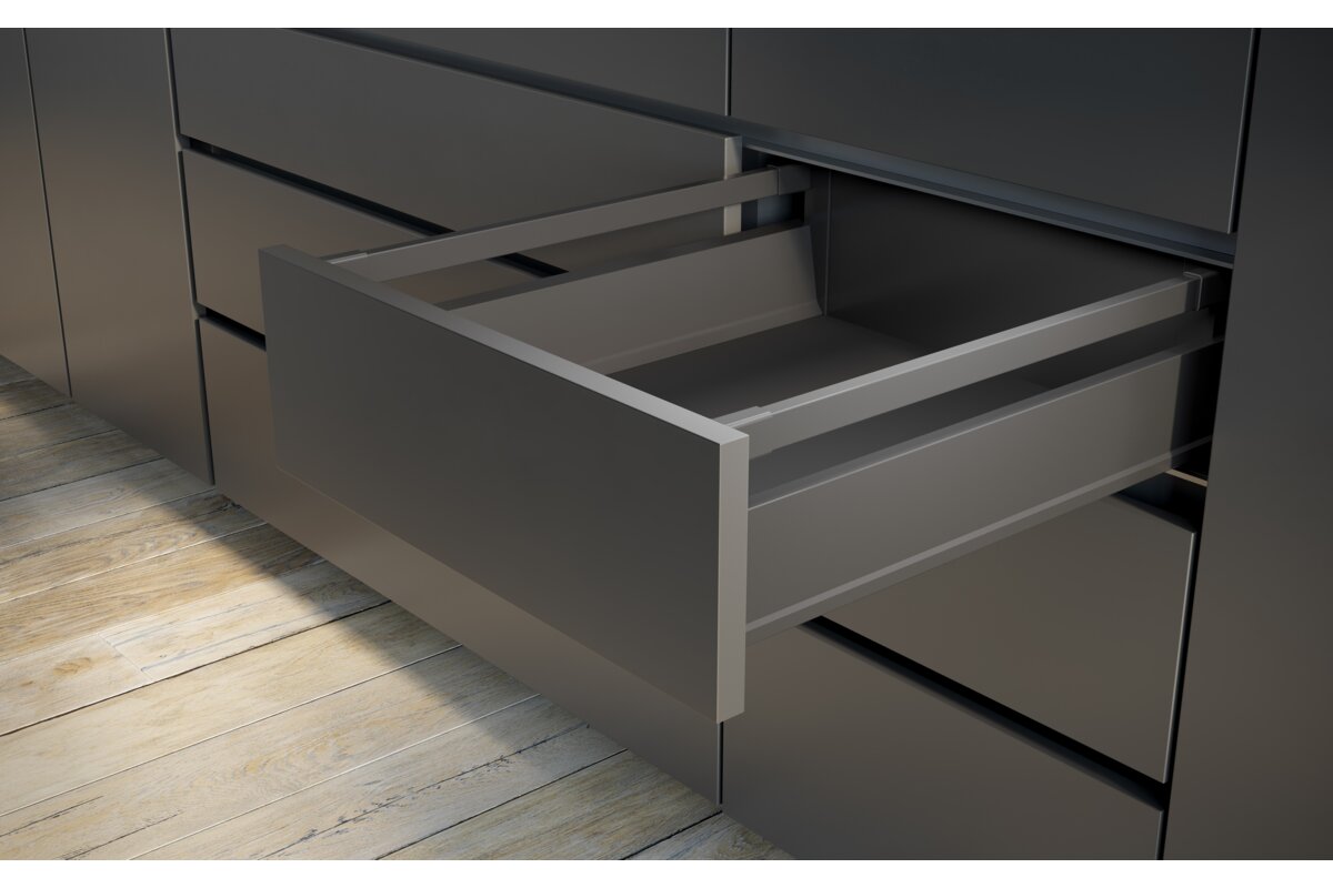 Modern Box Pro es una solución ergonómica y moderna para todo tipo de cocinas. Es perfecto para estancias pequeñas en las que cada metro libre cuenta, así como para espacios grandes que ofrecen mayores posibilidades de diseño. Modern Box Pro es la respuesta a las crecientes necesidades de los clientes en cuanto a accesorios de cocina de calidad y comodidad de uso. El sistema cumplirá las expectativas de los usuarios más exigentes. El cajón Modern Box Pro está certificado para 60.000 ciclos. El producto ofrece una capacidad de carga de hasta 40 kg. La comodidad de uso está garantizada por la extensión total en longitudes de 300 a 550 mm, un mecanismo de cierre suave y la sincronización del recorrido de las guías. El cajón está disponible en 4 variantes de altura (84, 135, 167, 199 mm), tanto para frentes empotrados como superpuestos. El cajón es fácil de instalar gracias al ajuste desde el interior, así como al rango de ajuste vertical y horizontal de +- 1,5 mm. Toda la gama de sistemas de organización del espacio, insertos para cubiertos, alfombrillas y clasificadores de residuos se adapta al cajón.