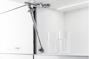 El elevador de gas con amortiguador y regulación permite diseñar armarios superiores modernos y funcionales. El elevador proporciona fluidez y amortiguación al abrir los armarios. Su mecanismo evita que el frontal se caiga lija y el uso de la tecnología de cierre silencioso mejora aún más el uso. De acero, se usará en colgajos con una altura frente de hasta 600 mm. Disponible en 3 colores: gris, blanco y antracita. El ángulo de apertura aproximado es de 75-90º, dependiendo de la bisagra a la que se utilice. Está disponible en 6 variantes de resistencia: 50, 60, 80, 100, 120 y 150 N. Durante el montaje, requiere el uso de bisagras.