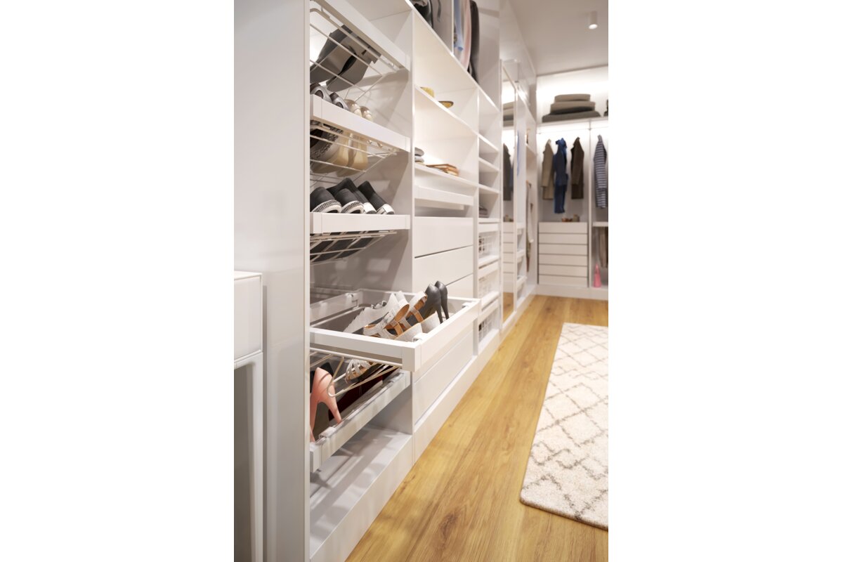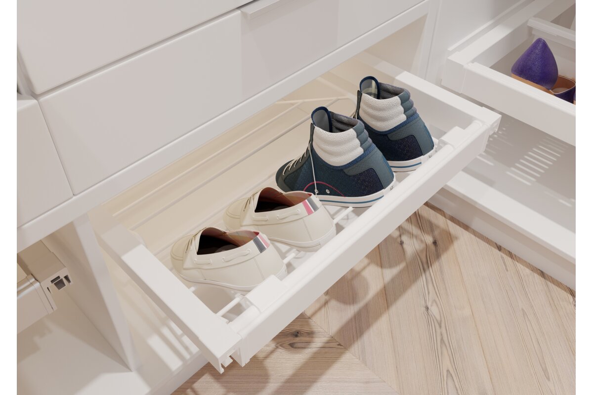 El cajón calado para zapatos ELITE funcionará en un armario independiente y en un armario más grande. Le permite mantener el orden en el apartamento y los zapatos en excelentes condiciones. El cajón está disponible en dos variantes de color y cuatro variantes de tamaño con la posibilidad de ajustar el ancho a la carrocería. La tecnología de cierre silencioso y la extensión total facilitan el uso diario del cajón. El juego está dotado de dos piezas de guías de montaje inferior, dos piezas de guías de montaje, dos piezas de montaje para cesto, un marco con anchura ajustable +/- 58 mm, cesto de alambre, calado y tornillos.