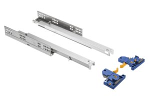 Guide de montage inférieur moderne avec mécanisme de fermeture silencieux, disponible en variantes en huit dimensions. Fabriqué en acier recouvert d’un revêtement de zinc pour protéger contre la corrosion. Il utilise une technologie de montage slip-on avec un embrayage, ce qui ne nécessite pas l’utilisation d’outils. De plus, le montage inférieur se caractérise par une fixation cachée au fond du tiroir, ce qui vous permet de maintenir une esthétique élevée. Le mécanisme de fermeture silencieux augmente le confort d’utilisation, c’est pourquoi le système fonctionnera très bien dans les pièces de tous les jours. L’extension complète permet d’accéder à toute la profondeur du tiroir, et le réglage en 3 plans sans l’utilisation d’outils facilitera le processus d’assemblage et le réglage approprié de la glissière du tiroir. Le produit trouvera son application universelle pour les tiroirs à parois latérales en matériau d’une épaisseur de 16 à 19 mm. De plus, la durabilité du produit est certifiée pour 60 000 cycles et résiste à des charges allant jusqu’à 30 kg.