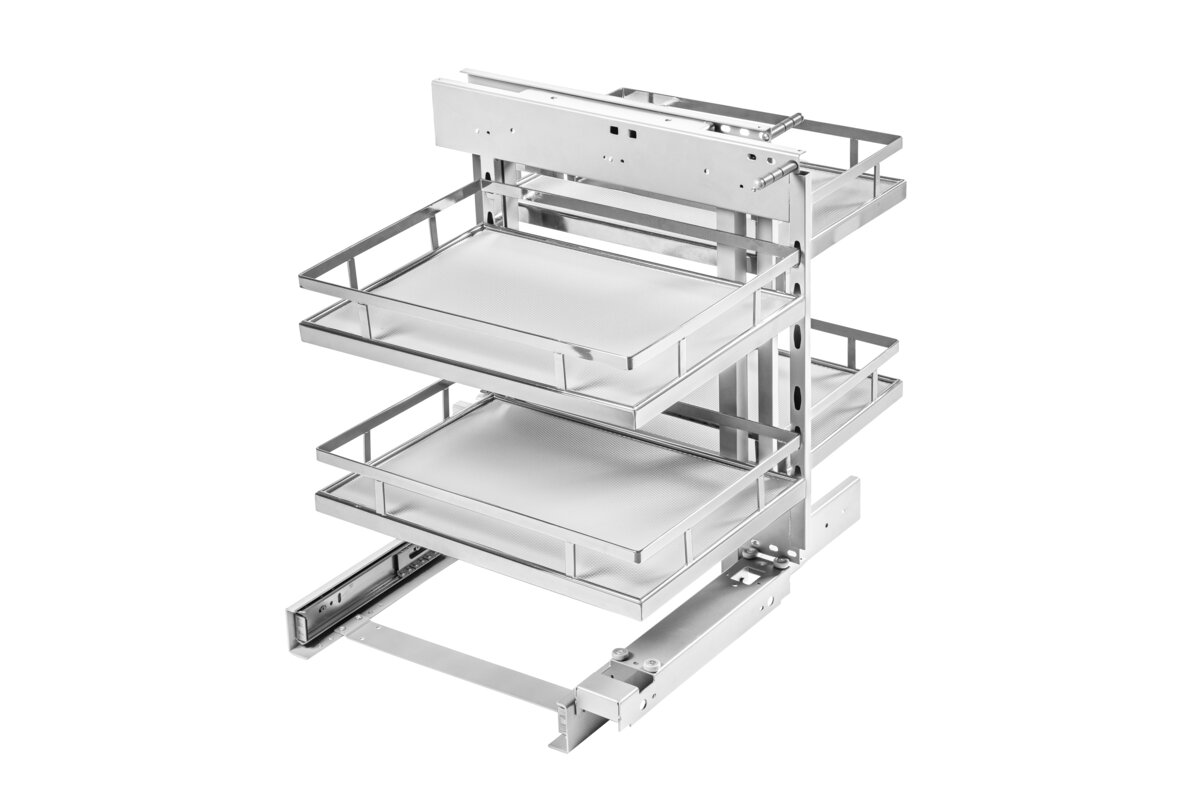 Košare Magic Corner iz serije MOVIX PRO iz GTV-a ergonomski su sustav za pohranu moderne kuhinje. Omogućuju vam maksimalnu optimizaciju teško dostupnih mjesta – tj. kuhinjskih kutova. Na taj način dobivamo prostor koji bi bio neiskorišten. Može se koristiti za pohranu lonaca, tava i kućanskih aparata (npr. mješalice, miješalice, sokovnici, parobrodi itd.). Košara za izvlačenje daje nam mogućnost montaže na dva načina: sa ili bez montaže na prednju stranu.