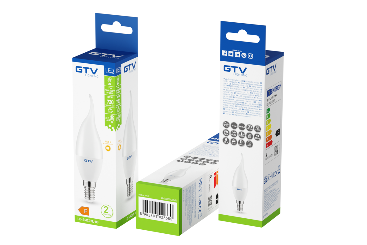 LED žarulja , C37, 8W, AC220-240V, topla bijela, E14, 700lm, KUT OSVIJETLJENJA 160°