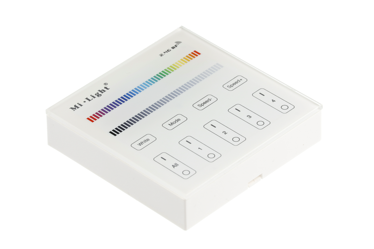 Panel dotykowy jest jednym z dwóch dostępnych urządzeń sterujących. Z panelem można sparować maksymalnie 4 kontrolery tworząc tym samym 4 strefy, którymi sterować niezależnie od siebie. Panel zasilany jest dwoma bateriami AAA (nie są dołączone do zestawu).