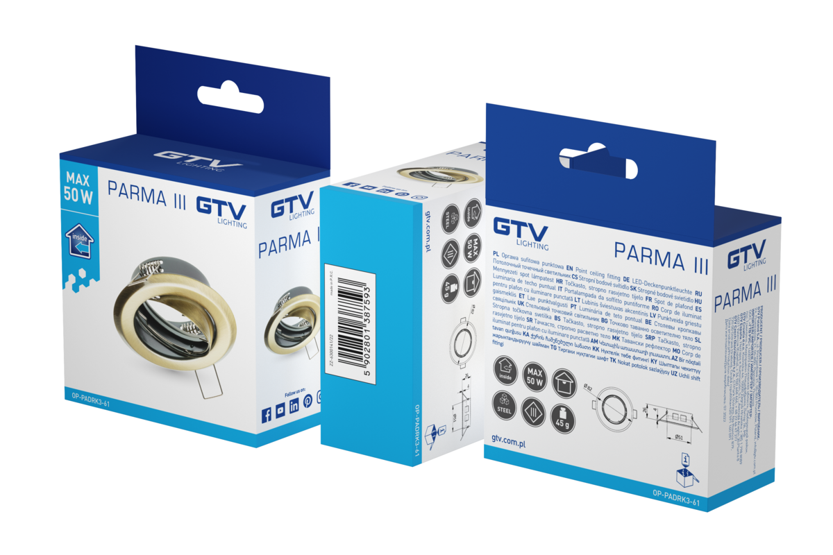 Punktowe oświetlenie sufitowe PARMA III powstało z wysokiej jakości stali. Dopracowane detale dbają o trwałość i niezawodną jakość punktów świetlnych. Dzięki prostemu designowi, podtynkowa oprawa sufitowa gładko wpisuje się w zróżnicowane style aranżacyjne – od minimalistycznych, przez nowoczesne, loftowe, a nawet klasyczne. Dla łatwiejszego dopasowania do potrzeb estetycznych, oprawa punktowa jest dostępna w 5 wariantach kolorystycznych: chrom, czarny chrom, biel, satyna oraz stare złoto. Dopracowany kształt, ze „ściętym” bokiem sprawia, że punktowa oprawa spaja się wizualnie z powierzchnią, na której jest montowana.