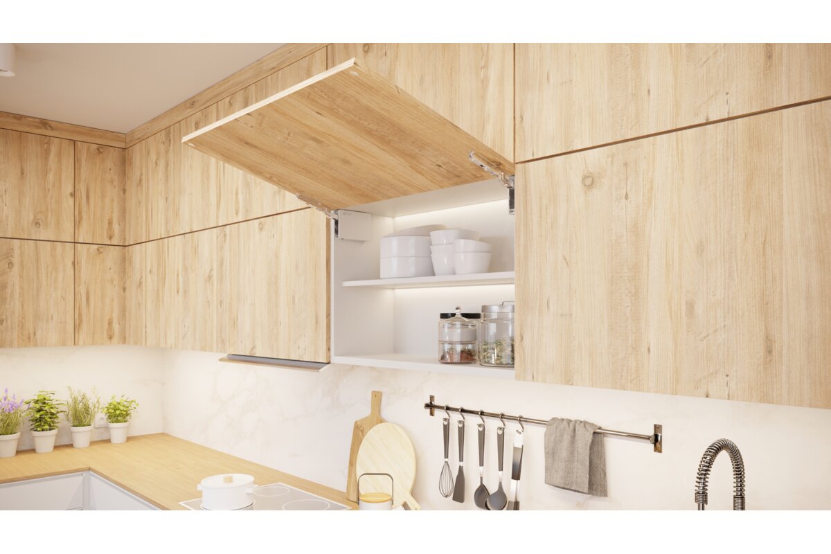 Podnośnik mechaniczny, który ułatwia zaprojektowanie funkcjonalnych oraz nowoczesnych szafek górnych. Dostępny w dwóch wersjach, soft close oraz push to open. Zapewnia płynność ruchu oraz amortyzację przy zamykaniu szafek. Umożliwia zatrzymanie klapy w dowolnym położeniu zadanym przez użytkownika. Posiada aż 3 rodzaje regulacji: siły działania, czasu domknięcia oraz kąta otwarcia w przedziale 90° do 105°. Podnośnik znajdzie swoje zastosowanie w klapach o wysokości od 300 mm do 650 mm. Możliwość wyboru aż czterech wariantów siły sprężyny dostosowanych do wysokości i ciężaru frontu, umożliwia szeroki zakres zastosowania. Dostępne są 3 warianty kolorystyczne zaślepek: biały, antracyt oraz czarny. Prosty montaż, bez użycia dodatkowych szablonów czy pomiarów gdzie konstrukcja podnośnika jest jednocześnie jego szablonem montażowym.