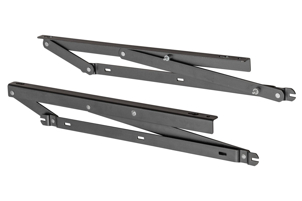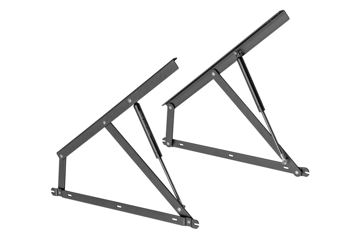 Podnośnik wykorzystywany do unoszenia ramy łóżka sypialnianego, umożliwiający łatwy dostęp do pojemnika na pościel. Aby uzyskać dostęp do schowka, należy podnieść ramę do góry. Wytworzony z wysokiej jakości stali, zapewniając trwałość i niezawodność w użytkowaniu. W tym modelu podnośnika zastosowane są sprężyny pneumatyczne. Możliwość dokupienia sprężyny o wybranej mocy (250-1800N) i wsuwek na podnośnik. Materiał: stal. Kolor: czarny. W komplecie