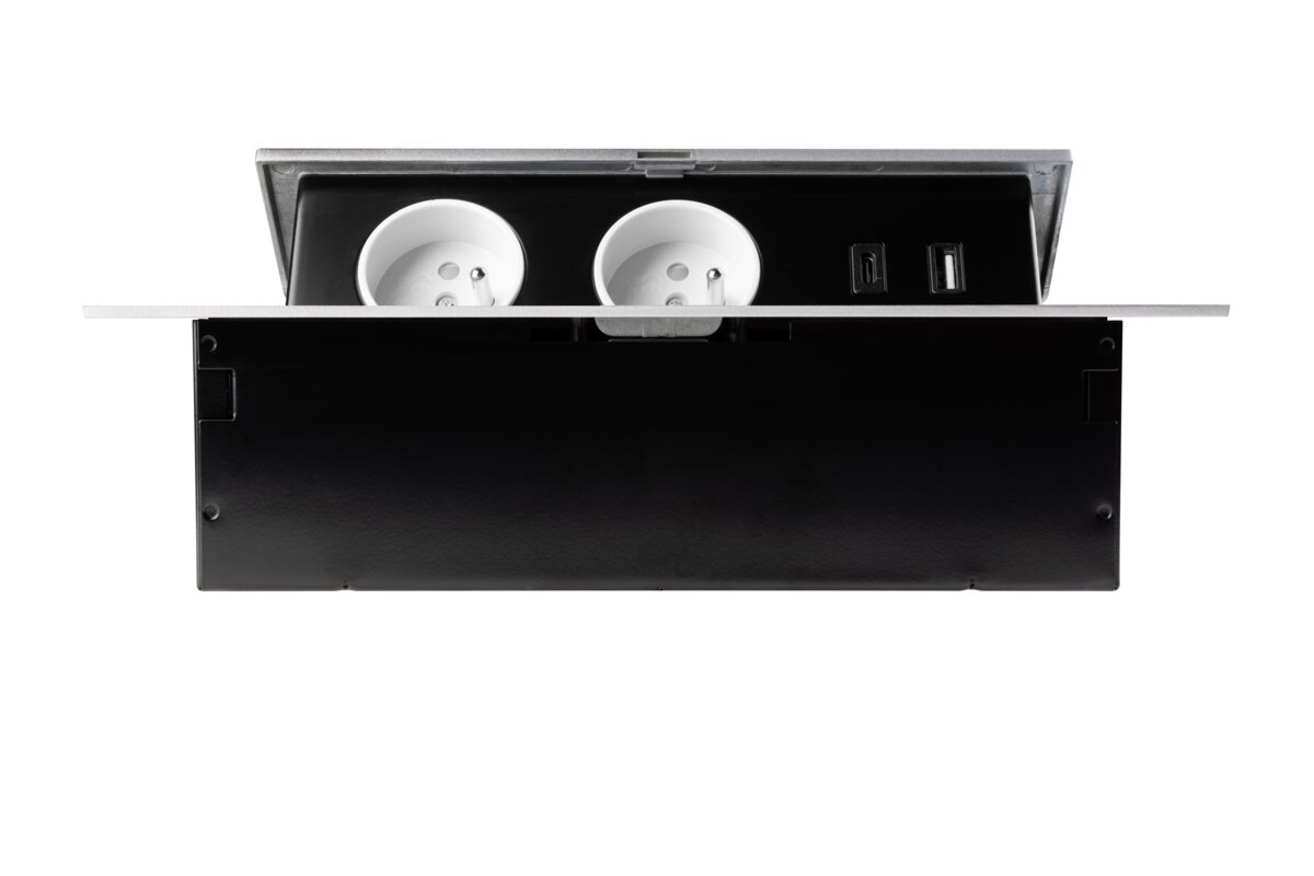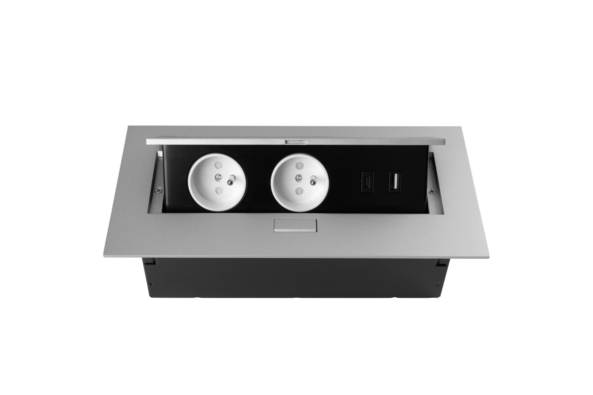 Классический прямоугольный встраиваемый удлинитель станет отличным решением для минималистов и людей, ценящих простоту. Он тонко сочетается с поверхностью любого письменного или классического стола. Доступен в стандартных цветах, подходящих к большинству столешниц: белом, черном и алюминиевом. Изделие поставляется в вариантах с 3 розетками питания или 2 розетками питания и 2 гнездами USB-A.