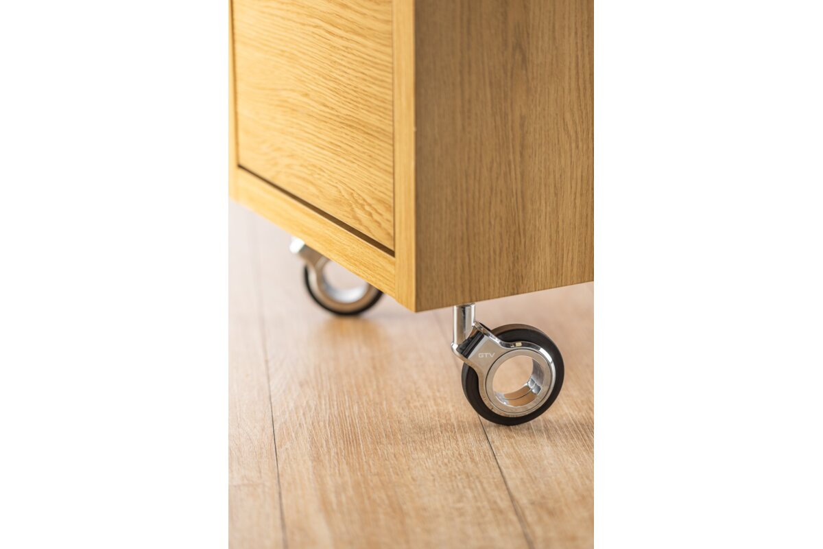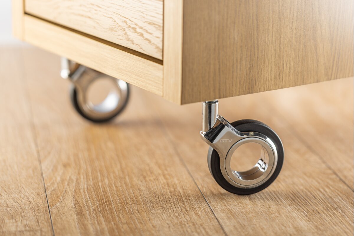 Rolka nábytku GIRA GTV je k dispozícii v dvoch priemeroch: 60 mm alebo 75 mm a dvoch výškach 94 mm alebo 107 mm. Je k dispozícii vo farebných variantoch: chróm s prídavkom čiernej alebo šedej matnej farby.