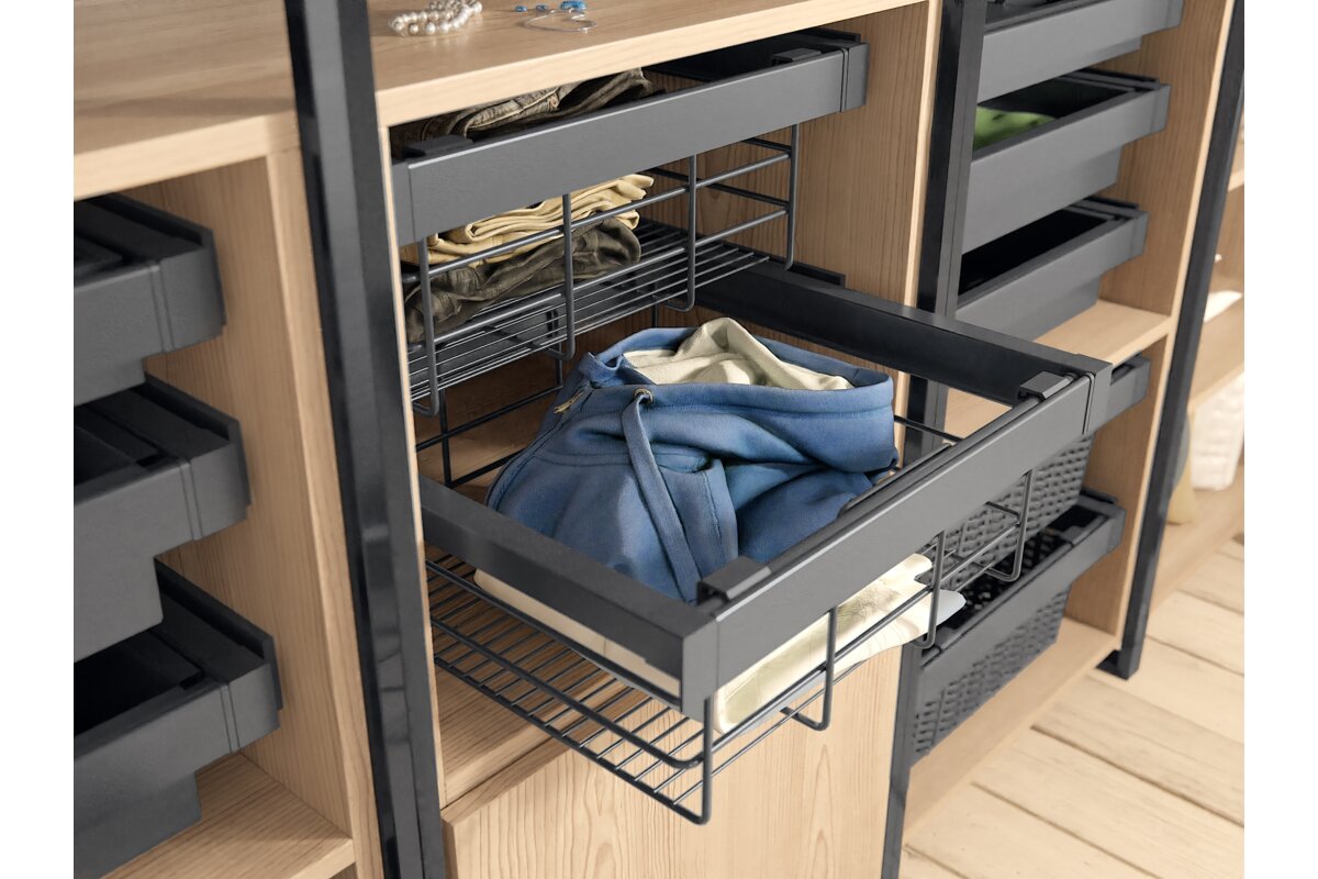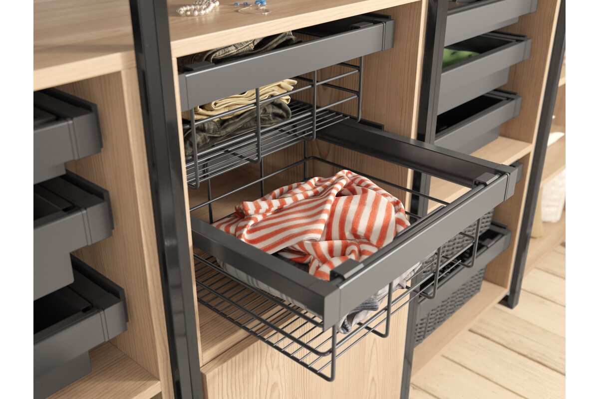 Prelamovaná zásuvka z línie ELITE je funkčným riešením pre každý šatník. Jednoduchým a rýchlym spôsobom vám umožní usporiadať priestor v šatníku. Vďaka nemu sú uložené predmety bezpečné a ľahko dostupné. Prelamovaný kôš ELITE je k dispozícii v dvoch farebných variantoch a štyroch veľkostných variantoch s možnosťou nastavenia šírky k telu. Technológia tichého zatvárania a plné rozšírenie uľahčujú každodenné používanie košíka. Sada je vybavená dvoma kusmi spodných montážnych vodidiel, dvoma kusmi vodiacich krytov, dvoma kusmi montáže koša, rámom s nastaviteľnou šírkou +/- 58 mm, drôteným košom, prelamovaným košom a skrutkami.