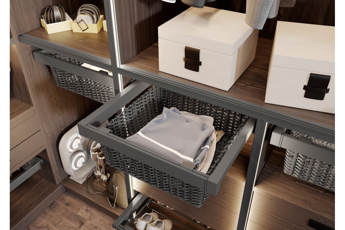 Ratanová zásuvka z línie ELITE je funkčným riešením pre každý šatník. Jednoduchým a rýchlym spôsobom vám umožní usporiadať miesto v šatníku. Vďaka nemu sú uložené predmety bezpečné a ľahko dostupné. Ratanový kôš ELITE je k dispozícii v dvoch farebných variantoch a štyroch veľkostných variantoch s možnosťou nastavenia šírky k telu. Technológia tichého zatvárania a plné predĺženie uľahčujú každodenné používanie košíka. Sada je vybavená dvoma kusmi spodných montážnych vodidiel, dvoma kusmi vodiacich krytov, dvoma kusmi montáže koša, rámom s nastavením šírky +/- 58 mm, ratanovým košom a skrutkami.