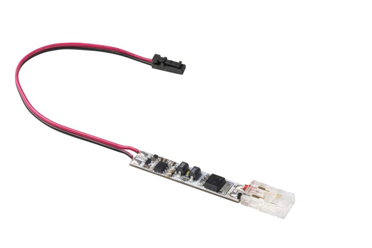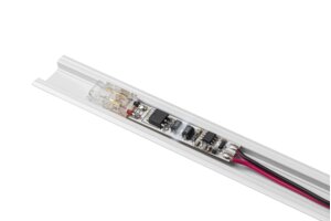 Безконтактний вимикач для монтажу всередині профілю, з одного боку він закінчується конектором COB, що дозволяє швидко монтувати стрічку COB до вимикача, а з іншого за допомогою кабелю міні-підсилювача довжиною 15 см. Він підтримує відрізки стрічки потужністю не більше 36 Вт для 12 В і 72 Вт для 24 В. Має функцію затемнення. Готовність до роботи позначається діодом. Це також полегшує пошук вимикача в темний час доби. Не підключайте перемикач під напругою. Перший запуск повинен відбуватися з кришкою на місці