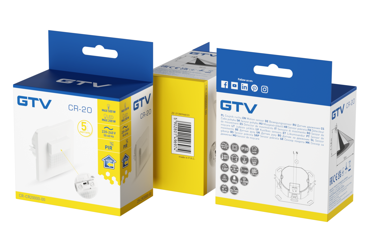 Датчик руху CR-20 - ідеальне рішення для людей, які цінують комфорт, безпеку та енергоефективність. Його монтаж швидкий і простий, а завдяки регульованим параметрам його можна ідеально адаптувати до конкретних умов конкретного приміщення.