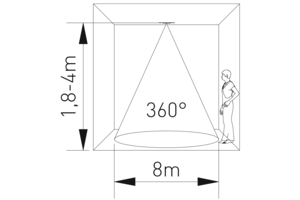 - Широкий кут виявлення: датчик руху CR-22 пропонує дальність виявлення на 360 градусів з радіусом дії до 8 метрів, що ідеально підходить для моніторингу великих приміщень.