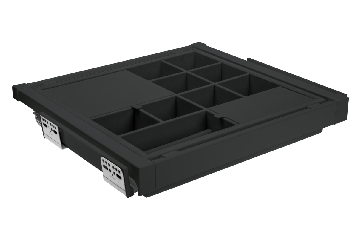Шухляда для ювелірних виробів ELITE має м'яку оксамитову підкладку та кілька відділень, щоб захистити ваші прикраси від пошкоджень і зберегти їх упорядкованими. Менші відділення ідеально підходять для зберігання сережок і каблучок, а більші легко вміщують аксесуари, такі як прикраси для волосся або сонцезахисні окуляри. Органайзер доступний у двох колірних варіантах та чотирьох варіантах розміру з можливістю регулювання ширини відповідно до корпусу. Технологія плавного закривання та повне висування дозволяють легко використовувати шухляду на щоденній основі. Комплект комплектується двома штуками нижніх монтажних напрямних, двома штуками напрямних кришок, двома штуками кріплення кошика, рамкою з регулюванням ширини +/- 58 мм, висувним ящиком з роздільниками та гвинтами.