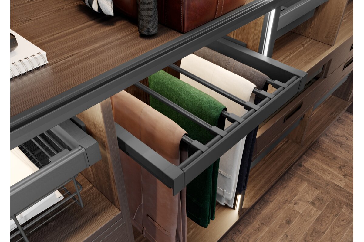 Ящик вішалки ELITE забезпечує місце для зберігання брюк. Він надзвичайно практичний завдяки безлічі відсіків. Випускається в двох колірних варіантах і чотирьох варіантах розмірів з можливістю регулювання ширини під корпус. Технологія безшумного закриття і повне розширення полегшують повсякденне використання ящика. Комплект оснащений двома шматками нижніх монтажних напрямних, двома шматками направляючих огороджень, двома шматками кріплення кошика, рамою з регульованою шириною +/- 58 мм, катанками (6, 7, 8, 9 шт. в залежності від розміру) і саморізами.
